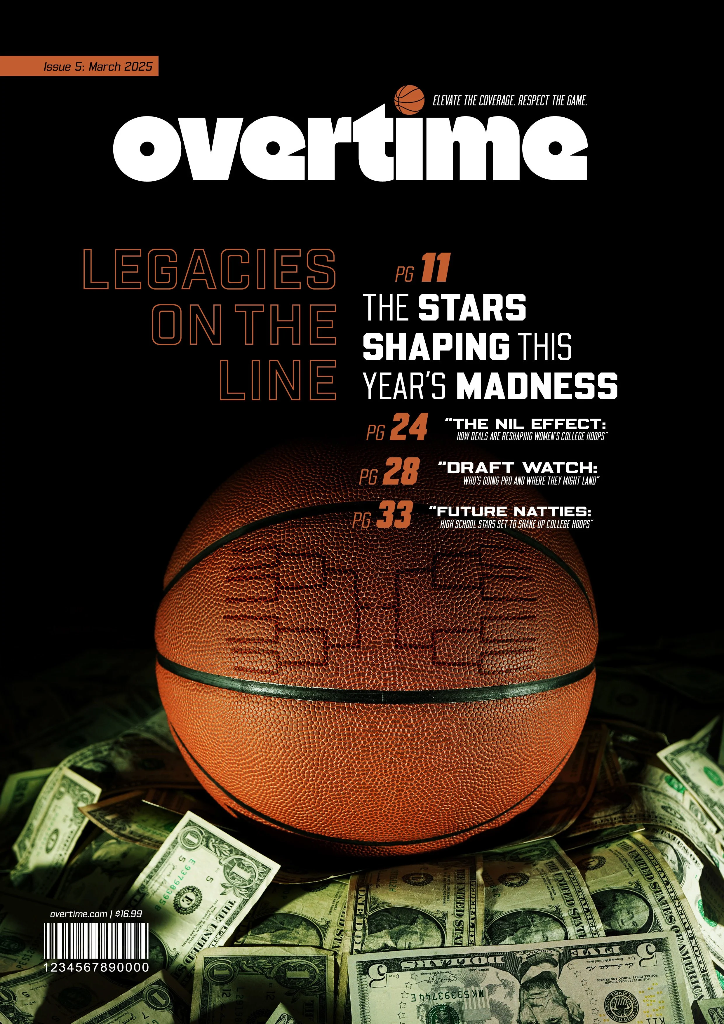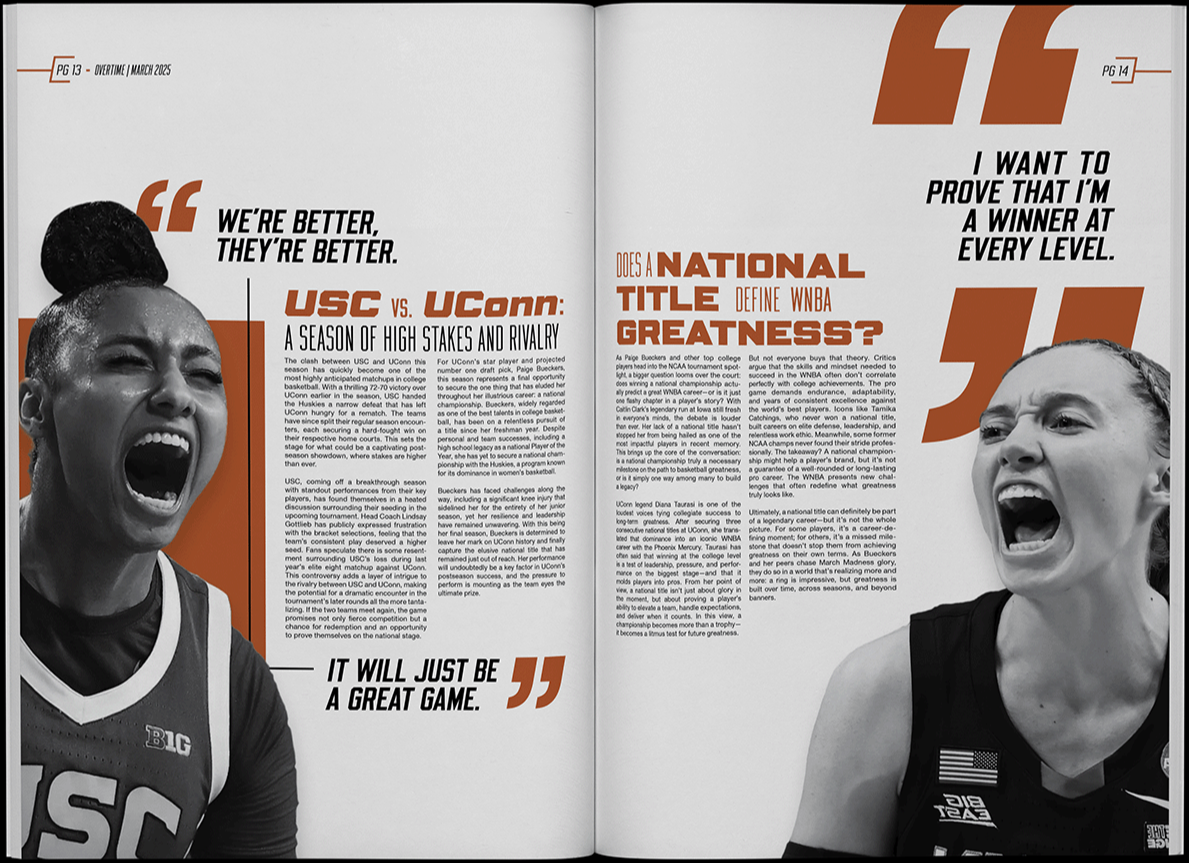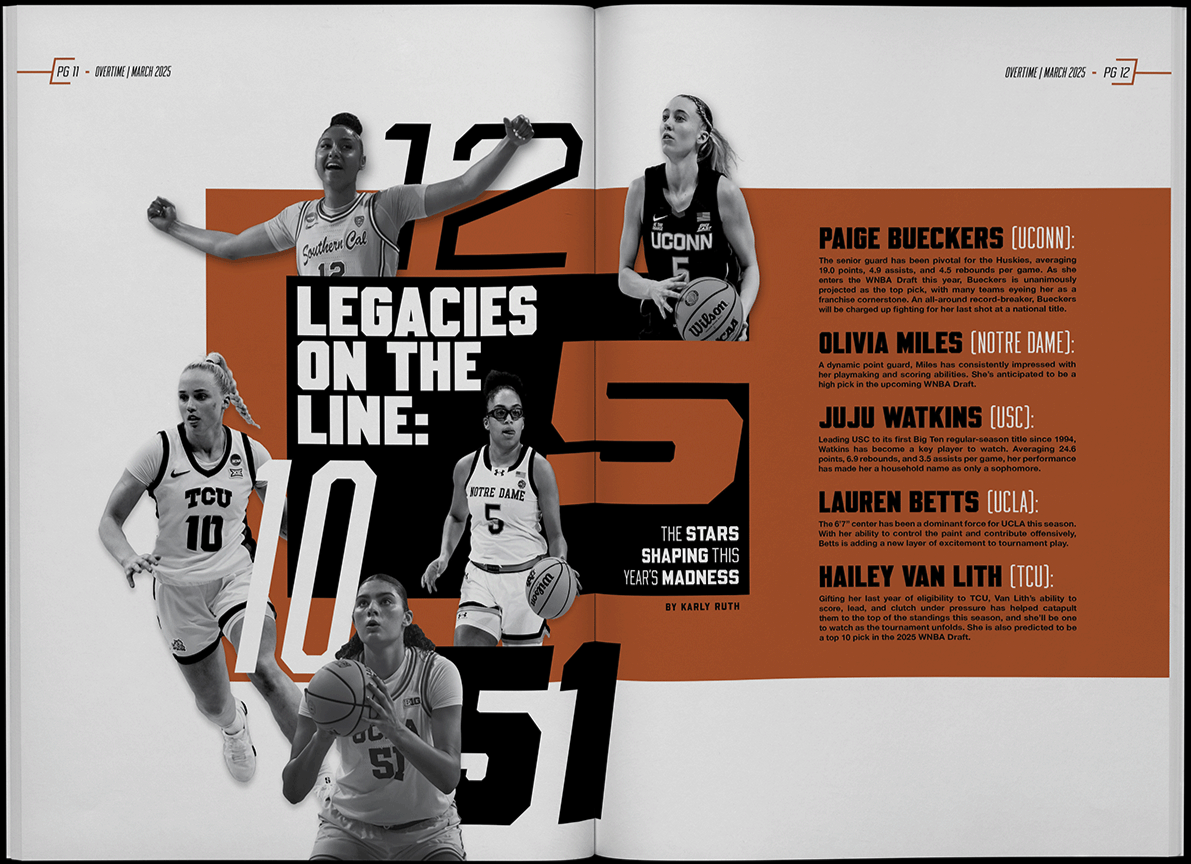 Overtime is a magazine concept centered around 2025 Women’s March Madness, featuring standout players to watch, a one-on-one rivalry, and a long-running debate that’s nearly as persistent as the GOAT conversation. The project explores how contemporary sports editorial design can capture the pace, tension, and narrative arcs of tournament play.