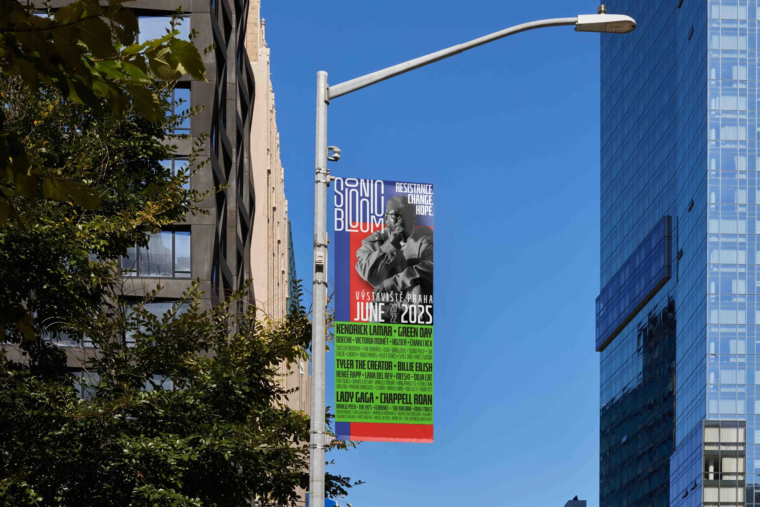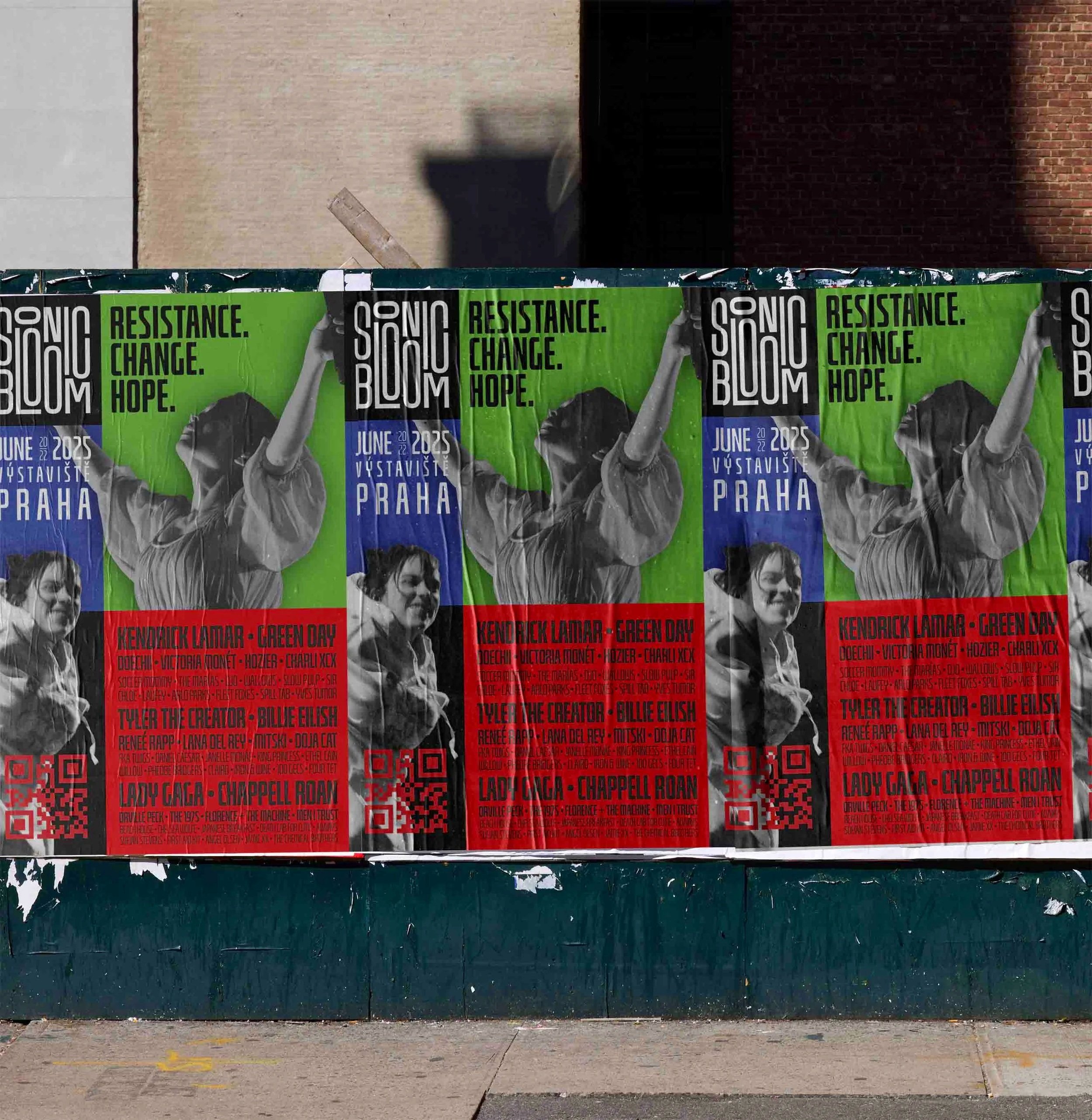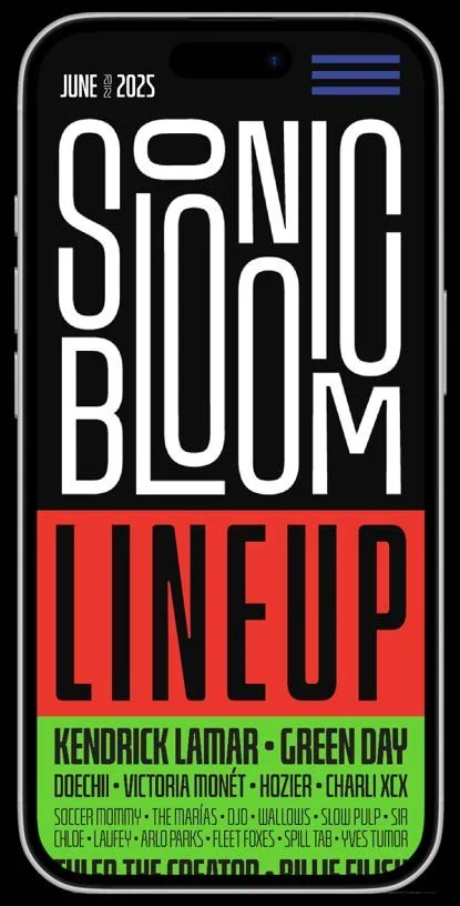 Sonic Bloom is a conceptual music festival built around art for activism, using music to foster community and collective action during times of political unrest. Guided by the tagline “Resistance. Change. Hope.” the project reframes live music as a space for connection, solidarity, and real-world impact.